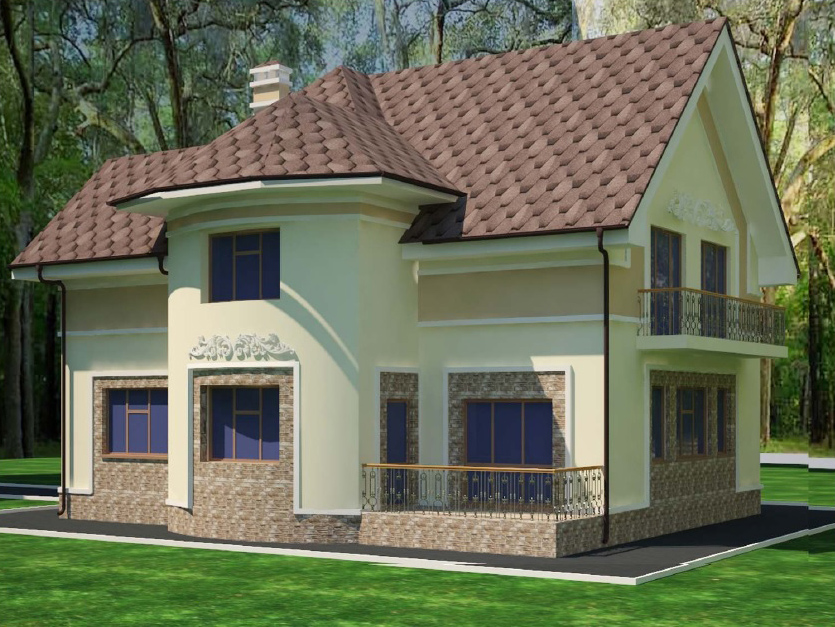 В этом доме всегда найдется место для большого семейства. За внешний вид строения отвечает декоративный камень в сочетании с фасадным молдингом и нежной и величественной лепниной.