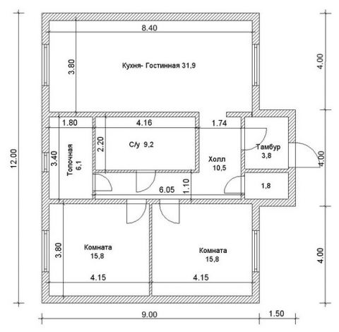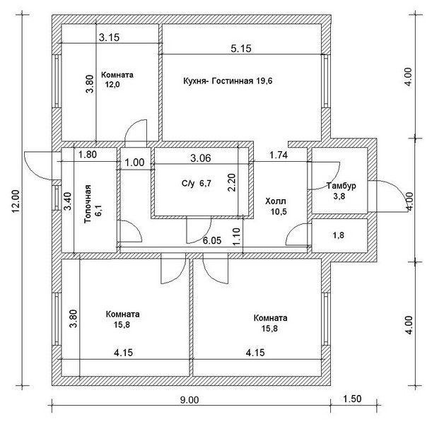 Предлагаем 3-хкомнатный одноэтажный дом для небольшой семьи. В доме имеется все необходимое — гардероб, две или три спальни, просторная кухня-гостиная, увеличенная ванная комната, холл, котельная (она же темная комната или постирочная), а также очень удобный выход на приусадебный участок.