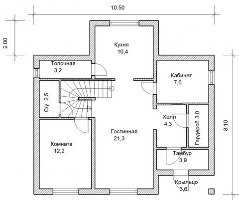 Планировка дома традиционна и необычна одновременно. Проектом предусмотрены два полноценных этажа. На первом этаже располагаются гостиная с кухней, небольшая спальня, кабинет, а также все технические и хозяйственные помещения. Из гостиной лестница ведет на второй этаж. На втором этаже расположены две спальни и второй санузел. Этот замечательный дом может стать комфортабельной дачей или загородным домом для небольшой семьи.
