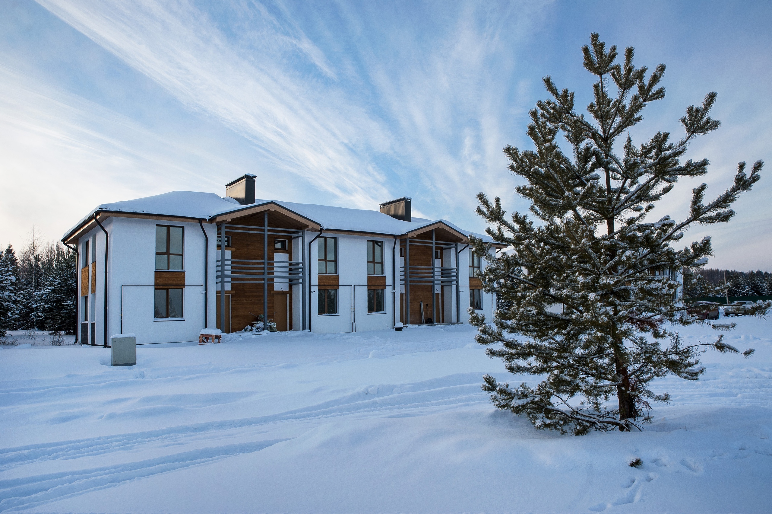• На территории положили газон, посадили хвойные и лиственные деревья и кустарники, установили скамьи для пикника и отдыха из высококачественной террасной доски.