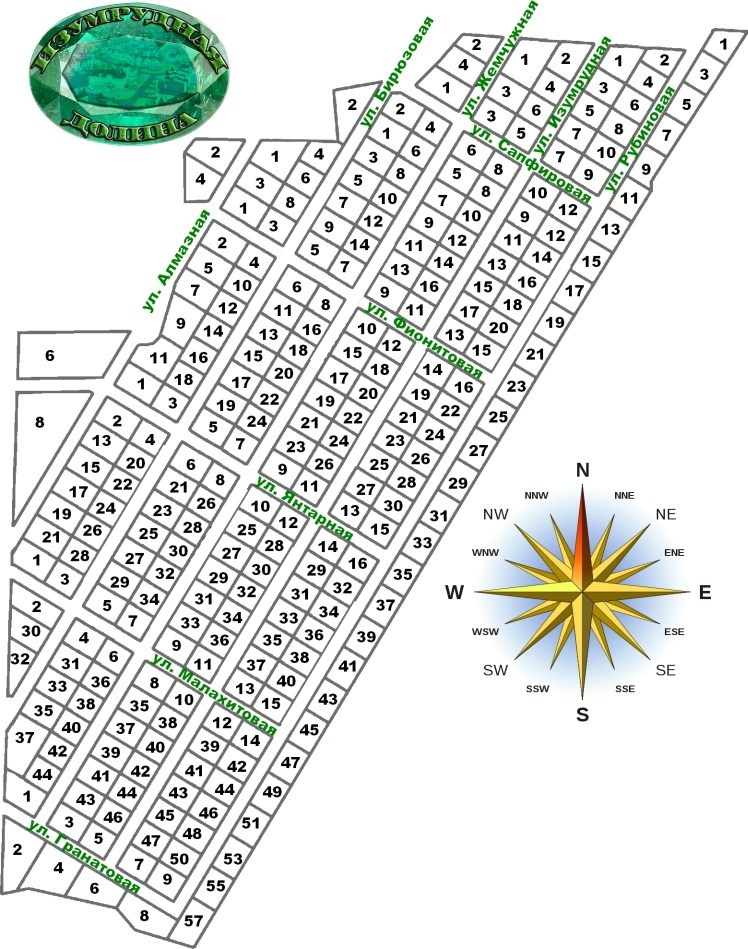 Поселок поделен на несколько улиц с названиями драгоценных камней (Фионитовая, Изумрудная, Жемчужная, Рубиновая и т.д.)