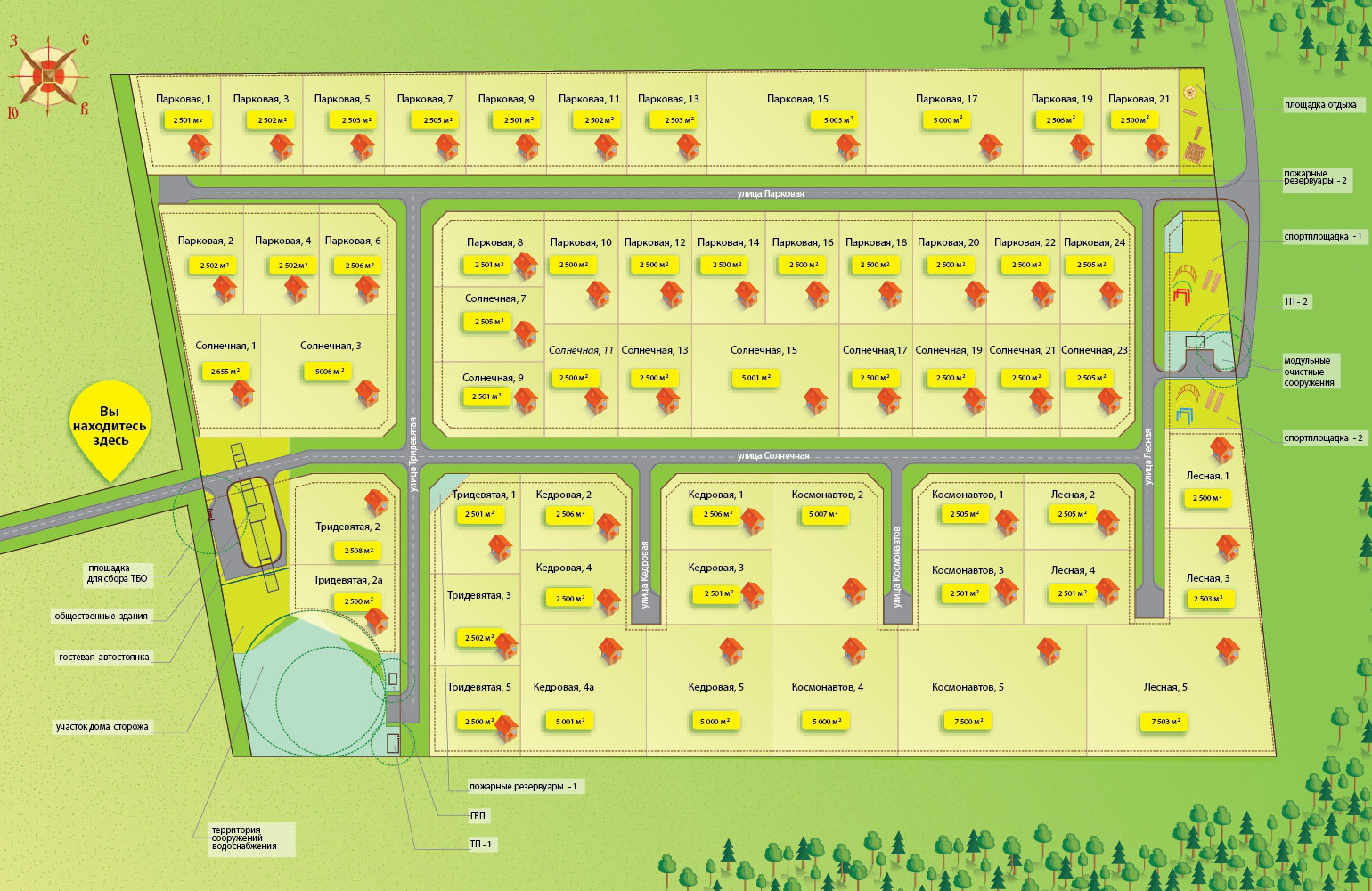 Общая площадь поселка 22 Га. Всего 55 участков площадью от 25 до 75 соток.