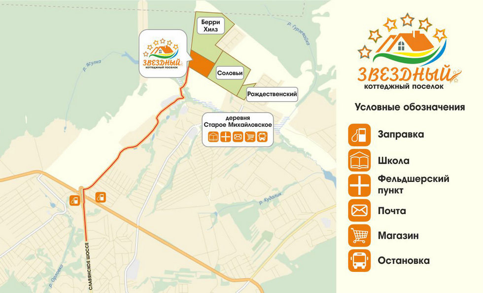Коттеджный поселок «Звездный» расположен в деревне Крестовоздвиженское Завьяловского района и граничит с Индустриальным районом Ижевска. До поселка можно добраться за 10 минут по Славянскому шоссе от Центрального ГИБДД.